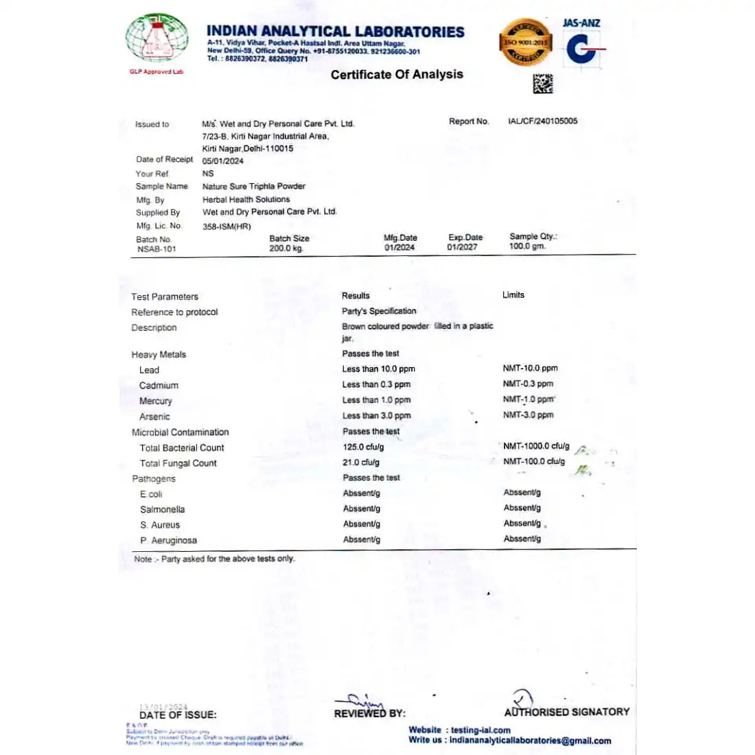 Nature Sure Triphala Powder is a pure plant-based product that is sourced directly from farms. This top certified quality product is non-GMO and does not contain any chemicals, preservatives, additives or colors. It has been processed and packed at an ISO and GMP certified unit. Its purity and authenticity have been certified by a GLP-approved laboratory.